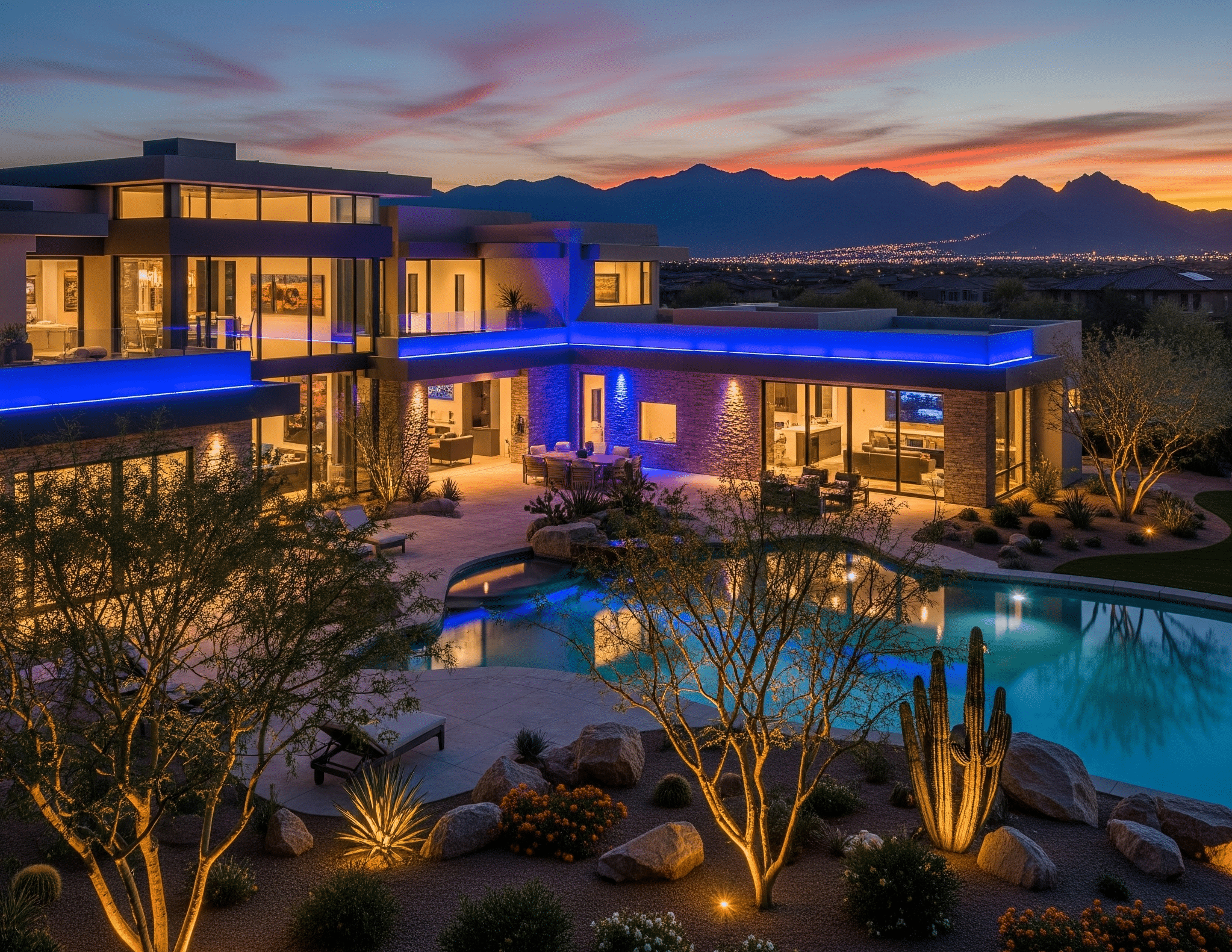 Vegas Lights systems are built to perform in every season, from desert summers to cool winter nights.  Whether you’re hosting a backyard dinner, relaxing by the pool, or welcoming guests at the front door, your lighting sets the perfect tone.  And when the holidays roll around? Your system easily transitions into festive mode—no additional installation required.